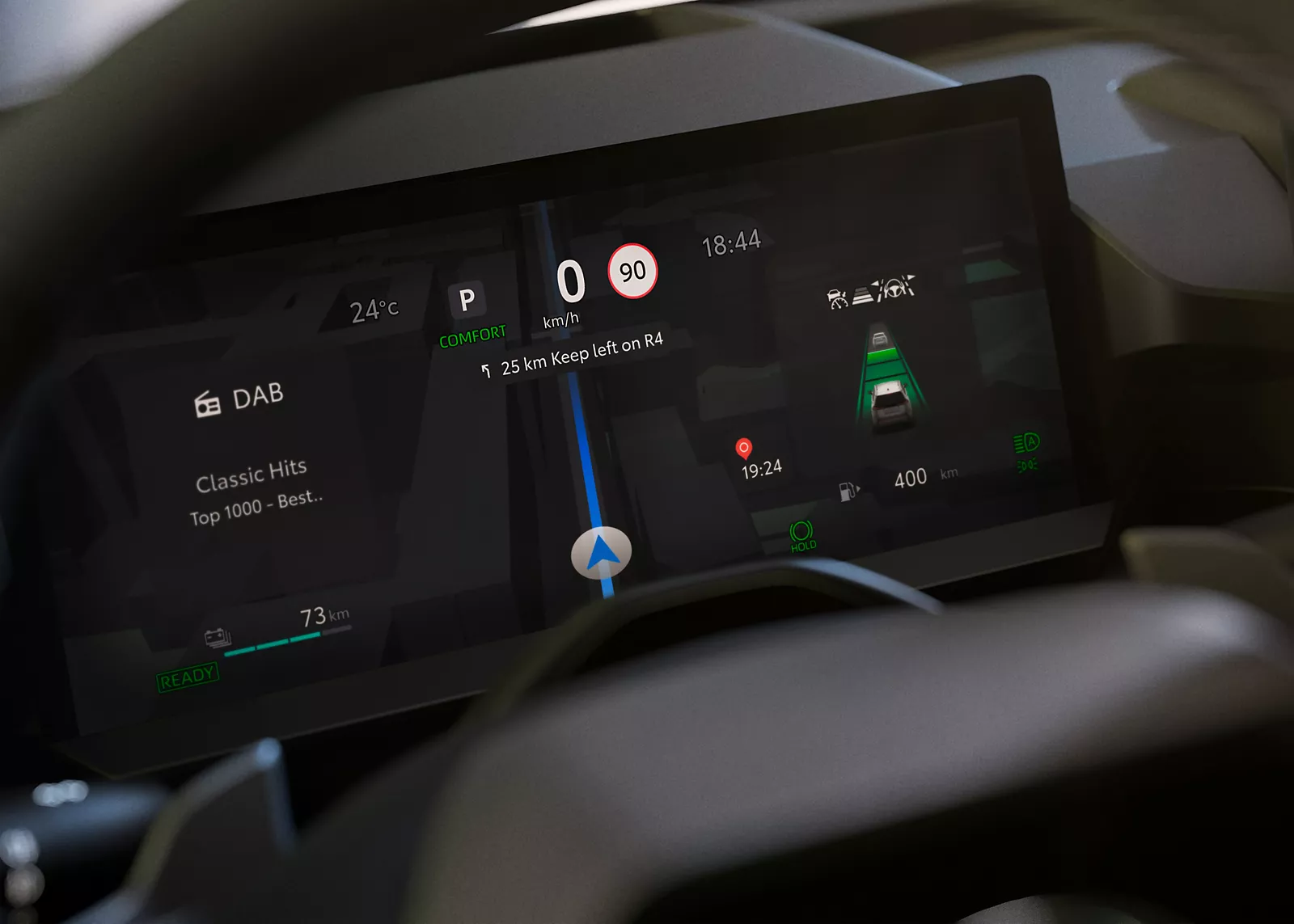 Az Ön stílusához szabható 12,3" digitális műszeregység a legfontosabb vezetési adatok mellett az akkumulátor állapotát, a vezetéstámogató funkciókat és a navigációt is megjeleníti.